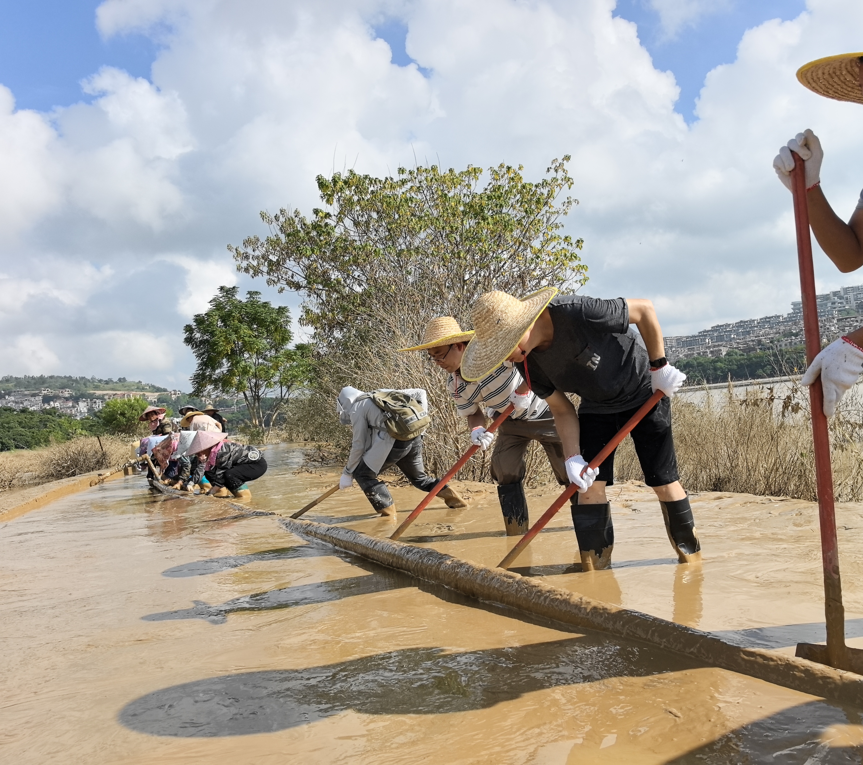 上午8點(diǎn),志愿者們攜帶鐵鏟、刮泥板、掃帚、垃圾袋等工具,準(zhǔn)時在指定區(qū)域集合。現(xiàn)場的淤泥最深處達(dá)10余厘米,腳一踩便陷進(jìn)去難以拔出,鏟子剛插進(jìn)泥里就被牢牢黏住?!按蠹曳止じ?,先刮表層泥,再清垃圾!” 隨著一聲號召,志愿者們迅速分組行動:有的彎腰緊握刮泥板,順著步道紋理反復(fù)刮除黏連的淤泥;有的扛著水管,利用高壓水槍沖刷地面;有的拎著垃圾袋,蹲下身細(xì)致?lián)焓安卦诓菘p里的垃圾;有的則推著清運(yùn)車,來回穿梭將裝滿淤泥和垃圾的袋子及時運(yùn)離現(xiàn)場…… 各個環(huán)節(jié)銜接緊密、井然有序。盡管天氣炎熱,汗水順著臉頰滑落、浸透衣衫,志愿者們的熱情與干勁絲毫未減,充分展現(xiàn)了國企的責(zé)任與擔(dān)當(dāng)。